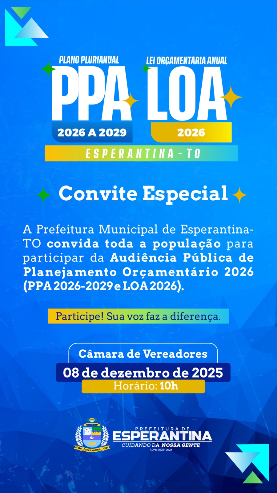 A Prefeitura Municipal de Esperantina-TO convida toda a população para participar da Audiência Pública de Planejamento Orçamentário 2026, que discutirá o Plano Plurianual (PPA 2026–2029) e a Lei Orçamentária Anual (LOA 2026). O encontro será realizado no dia 08 de dezembro de 2025, às 10h, na Câmara de Vereadores.